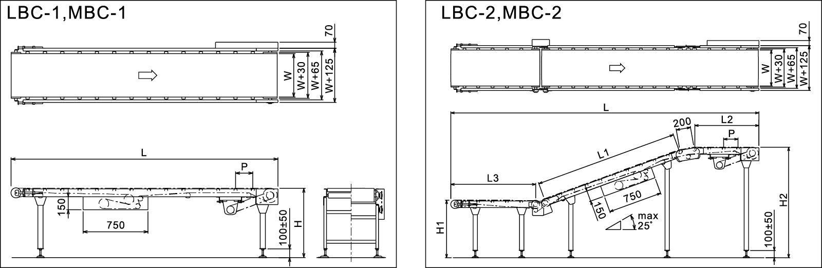 | Szállítószalag szélessége | W (mm) | BW 125 | BW 125 | BW 125 | BW 125 |