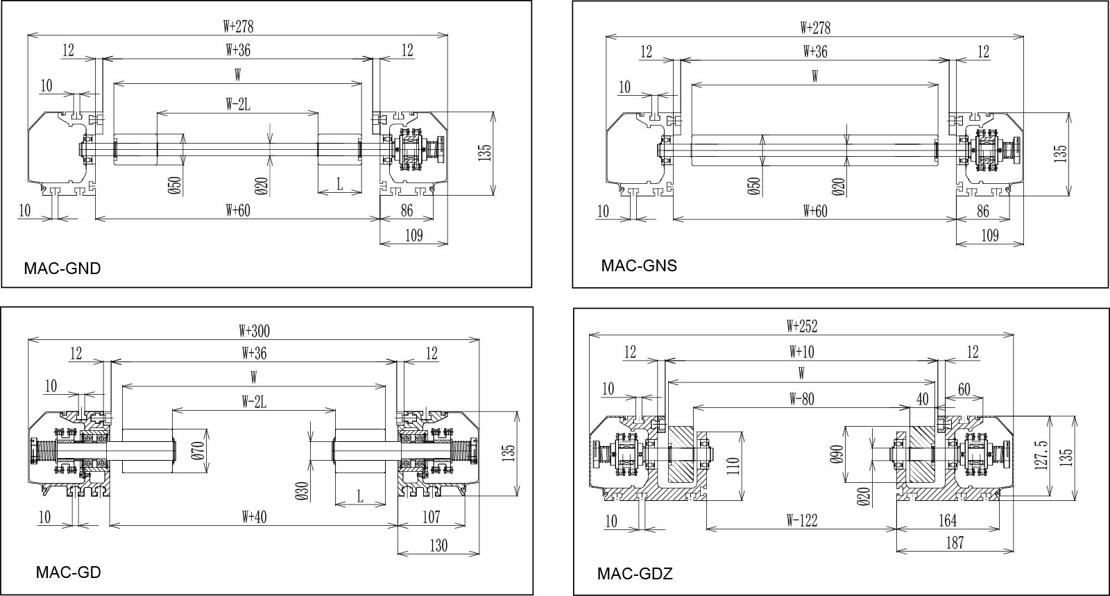 | Beír | MAC-GND (folyamatos tengelytípus) | MAC-GNS (dobtípus) | MAC-GD (konzolos szerkezet) | MAC-GDZ (nagy teherbírású típus) |
